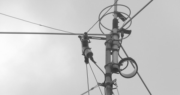 Ovviamente, le varie lunghezze, compatibili con le diverse frequenze, vanno un po` accordate, in modo da ridurre il ROS sulle varie bande (che, a quel punto, possiamo dire che «interagiscono» le une con le altre)... alla fine si ha una buona soluzione almeno per i 40, 30, 20 e 17 metri. Per le altre, considerata la ridotta dimensione di radiatori e radiali, varrebbe la pena costruire una verticale in alluminio (per 15, 12 e 10 metri, ad esempio... ma anche per 17, 20, 30 etc)