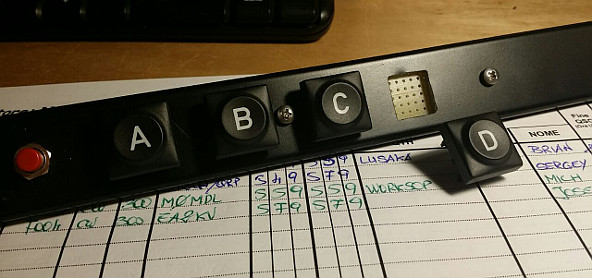 Tra i vari recuperi, avevo conservato quattro bei tastini, marchiati da A a D, provenienti da un vecchio centralino telefonico: quattro tastini normalmente aperti dal bel tocco che azionava il contatto... grazie alle loro caratteristiche, li ho arruolati subito per remotizzare i tasti da F1 a F4; per il tasto menu, visto che non deve essere premuto inavvertitamente, ho optato per un comune tastino tondo normalmente aperto e di colore rosso. Per i contatti del tasto (la remotizzazione di Punto, Linea e negativo) ho preferito aggiungere sul retro un connettore a 4 poli maschio da pannello: per intenderci quelli usati per i microfoni delle radio 27 Mhz.
