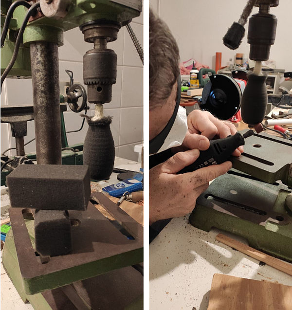 Ovviamente, non si tratta di un tornio tradizionale, ma di qualcosa eletto tornio per questa particolare occasione: un trapano a colonna e, al posto di uno scalpello, si usa un dremel con la testina abrasiva. Il risultato è visibile nelle foto.