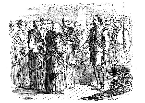 Finalmente, il 19 aprile del 1600, la nave giunse in vista delle coste della Baia di Usuki, nell'isola più meridionale del Giappone, Kyushu, arenandosi nel basso fondale. Solo 24 degli originali 110 membri dell'equipaggio erano sopravvissuti al difficile ed estenuante viaggio, durato quasi due anni, e meno di dieci si reggevano sulle proprie gambe. Tra essi, c'erano il pilota inglese William Adams (in blu nella foto in alto) ed il mercante Jan Joosten van Lodensteyn (vestito di rosso e col cappello in mano). Pensate: furono il primo inglese ed il primo olandese a giungere in Giappone!